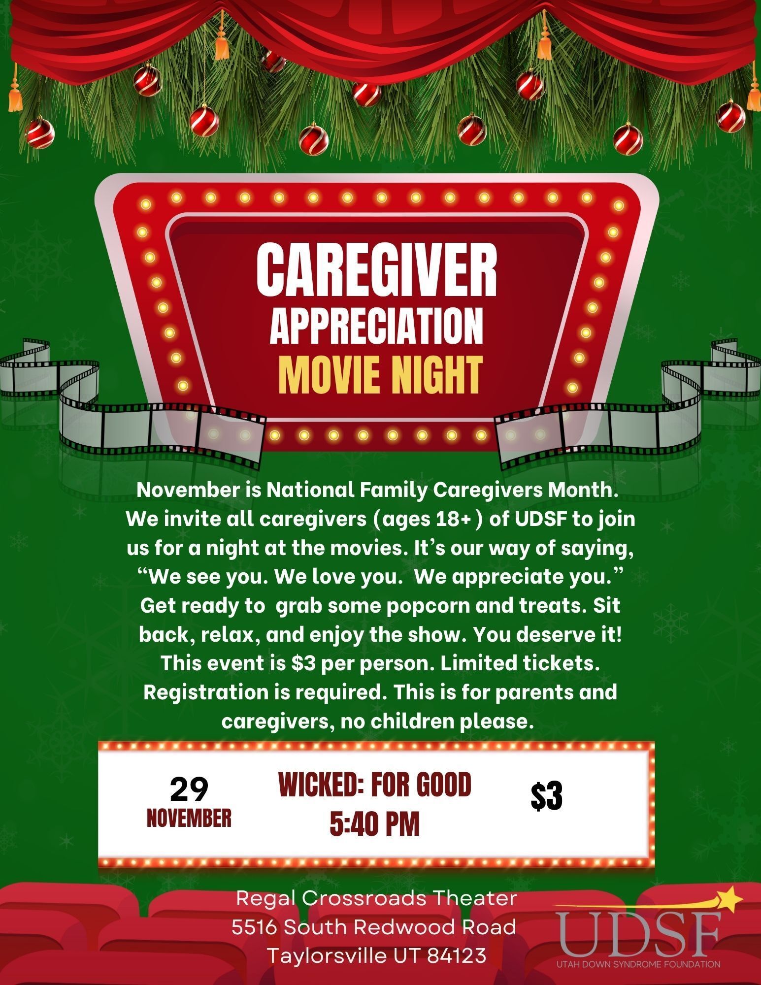 We invite all caregivers of UDSF 18+, to join us for a night at the movies. We've all been changed for good having someone to love with Down syndrome so come watch Wicked: For Good with us. Enjoy some popcorn and treats, then sit back and relax. It's our way to say we see you and appreciate you!