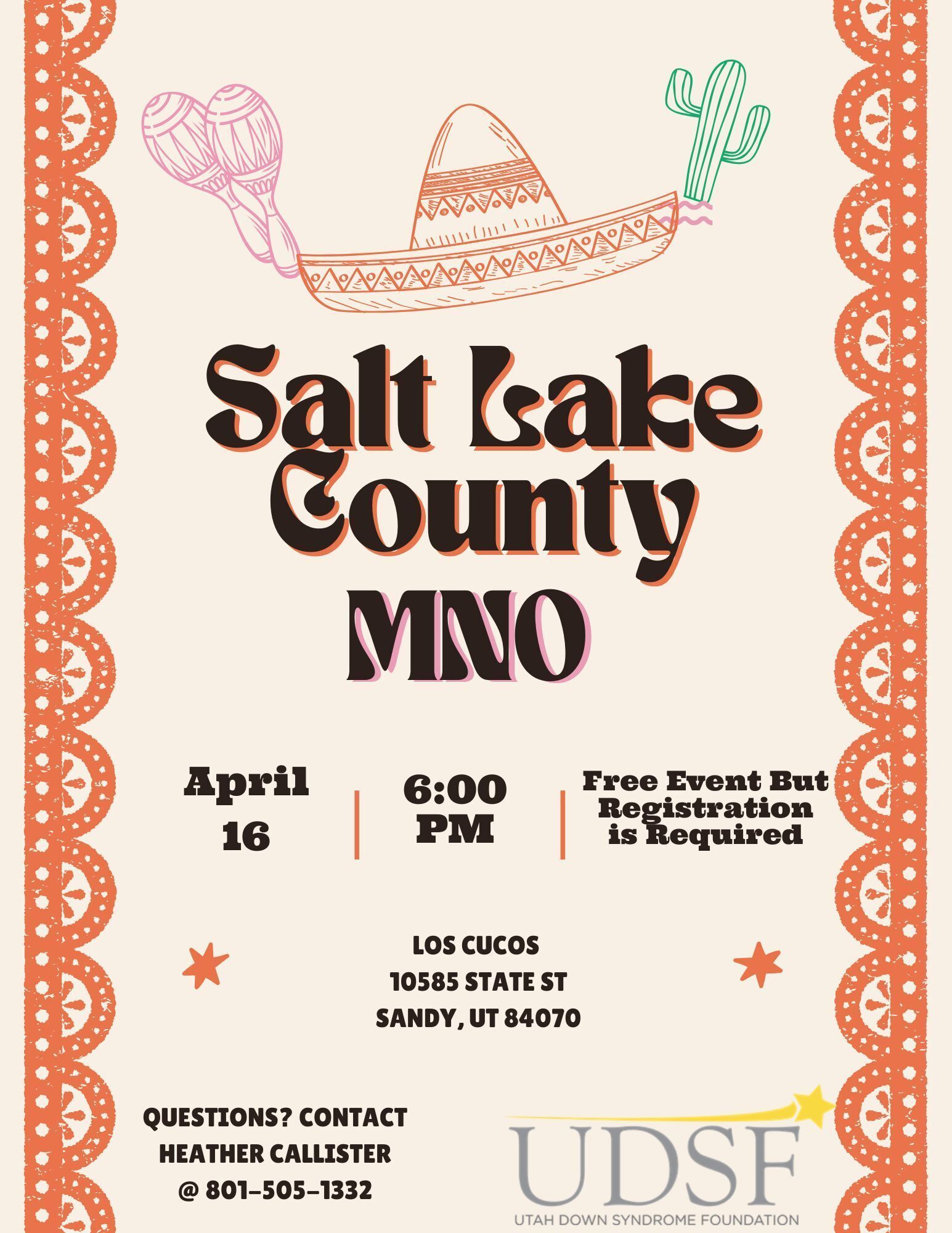 Come join us for Salt Lake County Moms' Night Out Thursday, April 16, 2026 at 6 pm. We are meeting at Los Cucos 10585 State St, Sandy, UT 84070. Come enjoy a dinner out and meet other Ds moms. If you have questions contact Heather Callister @ 801-505-1332