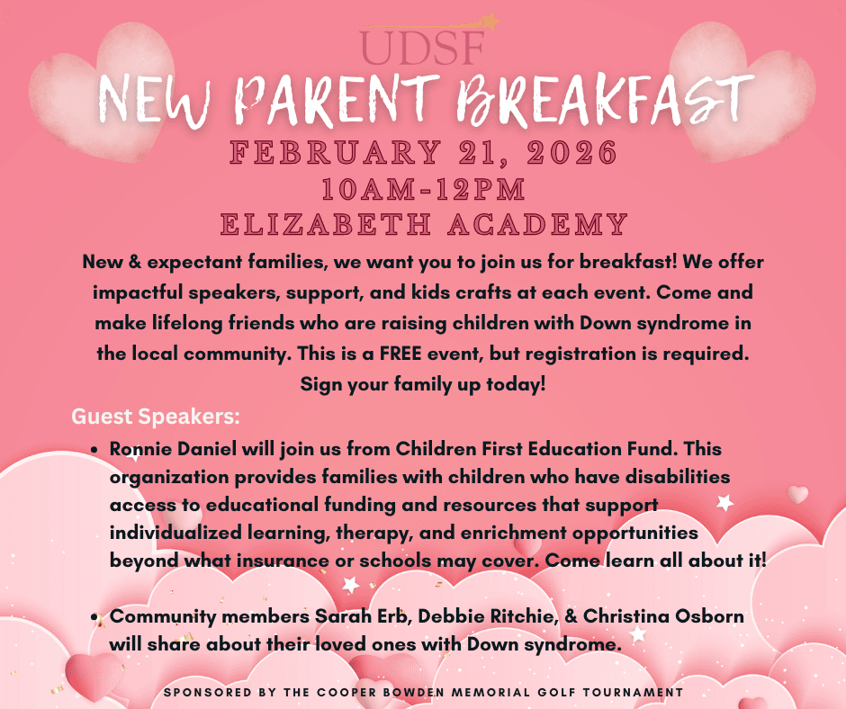 Join UDSF for breakfast! Come mingle with other new families in our community & learn helpful tools for your parenting journey. This event is FREE for families who are raising kiddos with Down syndrome (3 & under), and as always, families are welcome to attend as many of these events as they would like.
