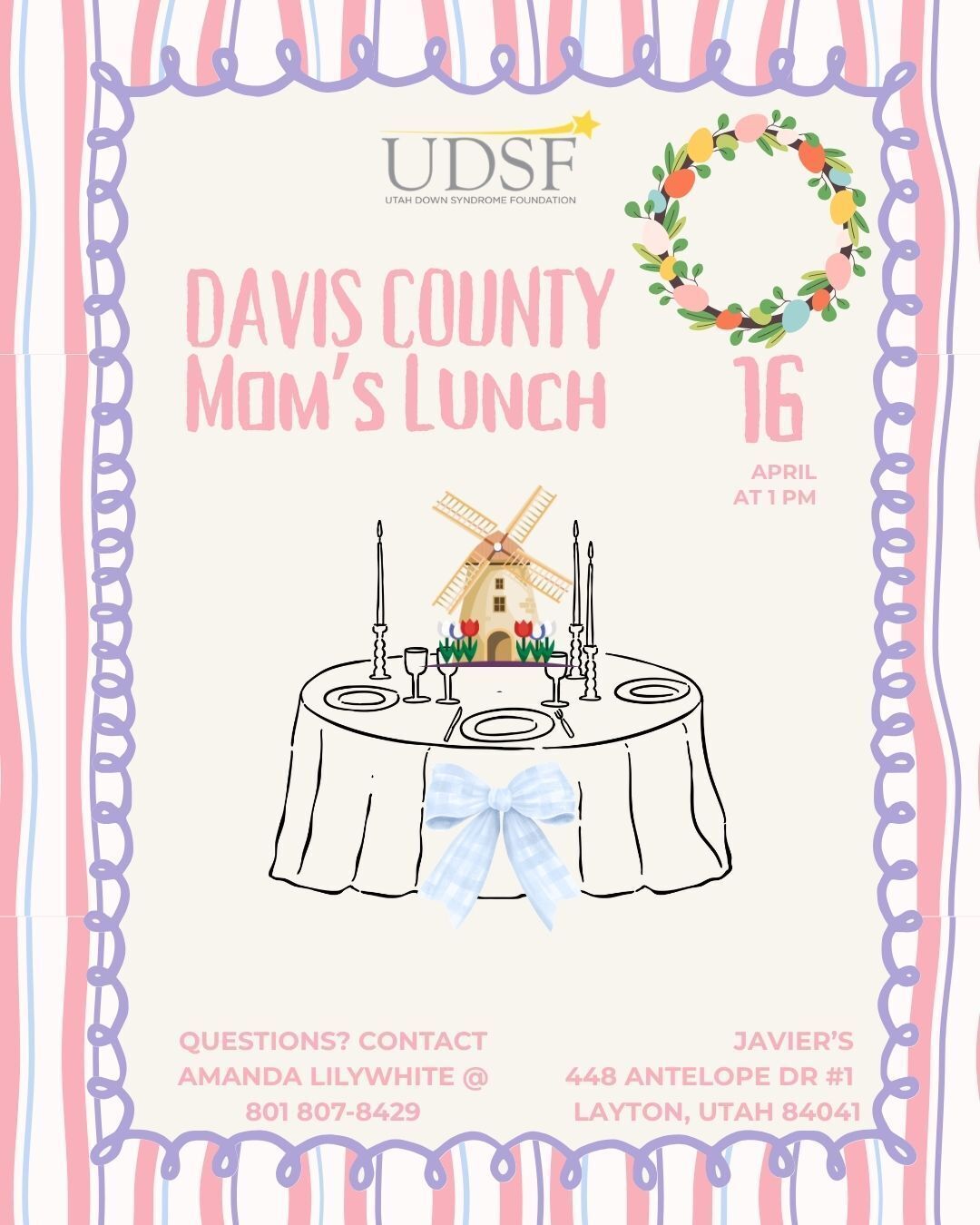 Come join us for Davis County Moms' Lunch Out Thursday April 16, 2026 at 1 pm. We are meeting at Javier's in Layton. 448 Antelope Dr #1 Layton, Utah 84041. Come enjoy a lunch out, and meet other Ds moms. If you have questions contact Amanda Lilywhite @ 801-807-8429.